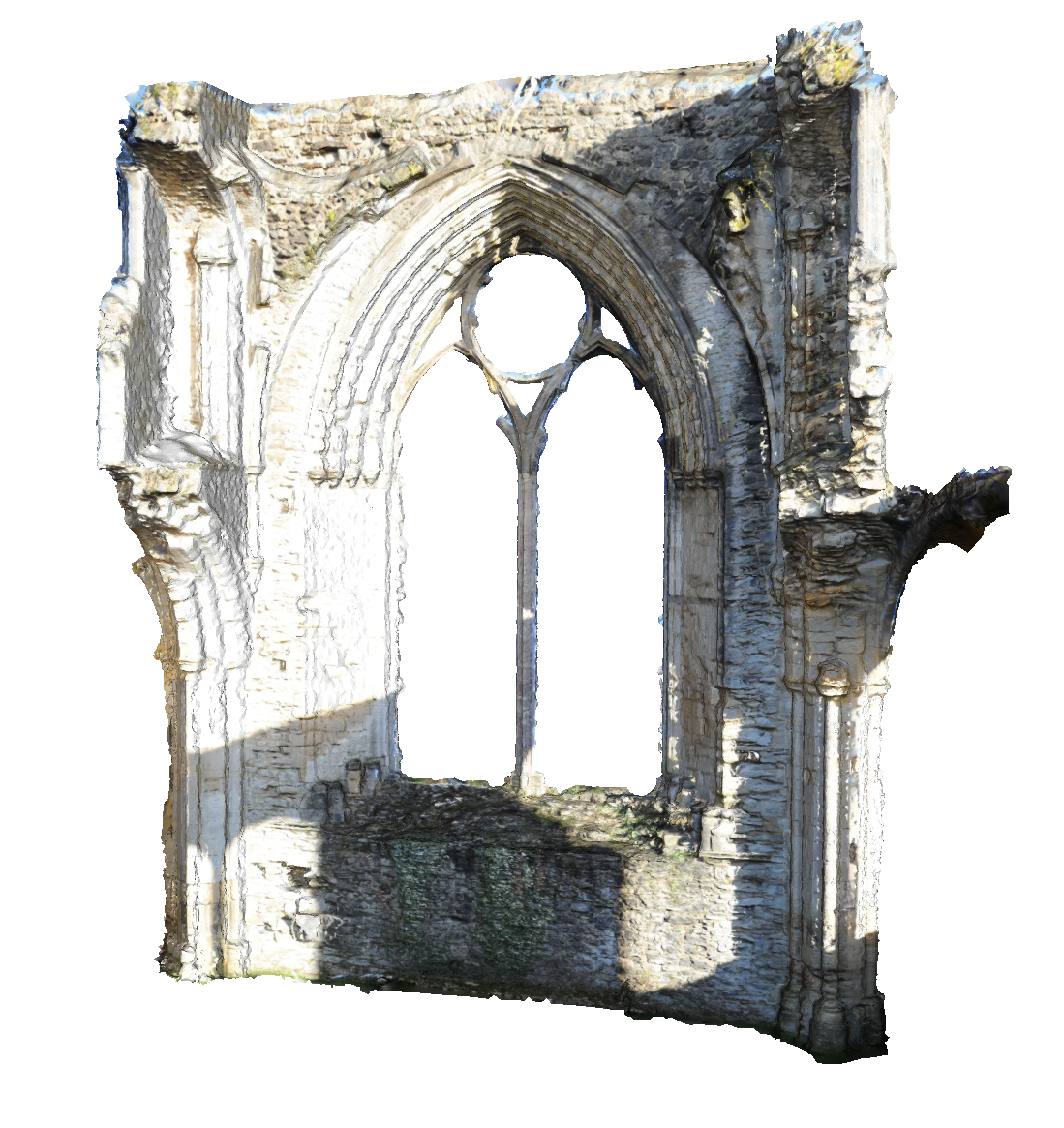 Photogrammetry was used on a number of different areas within the building to highlight the differences between small object and large object data collection techniques. These were then used within Dan’s work as a way to compare the different recording techniques through the final representations available. Below are two renders of the the East window of the abbey and a a rendered image of a column