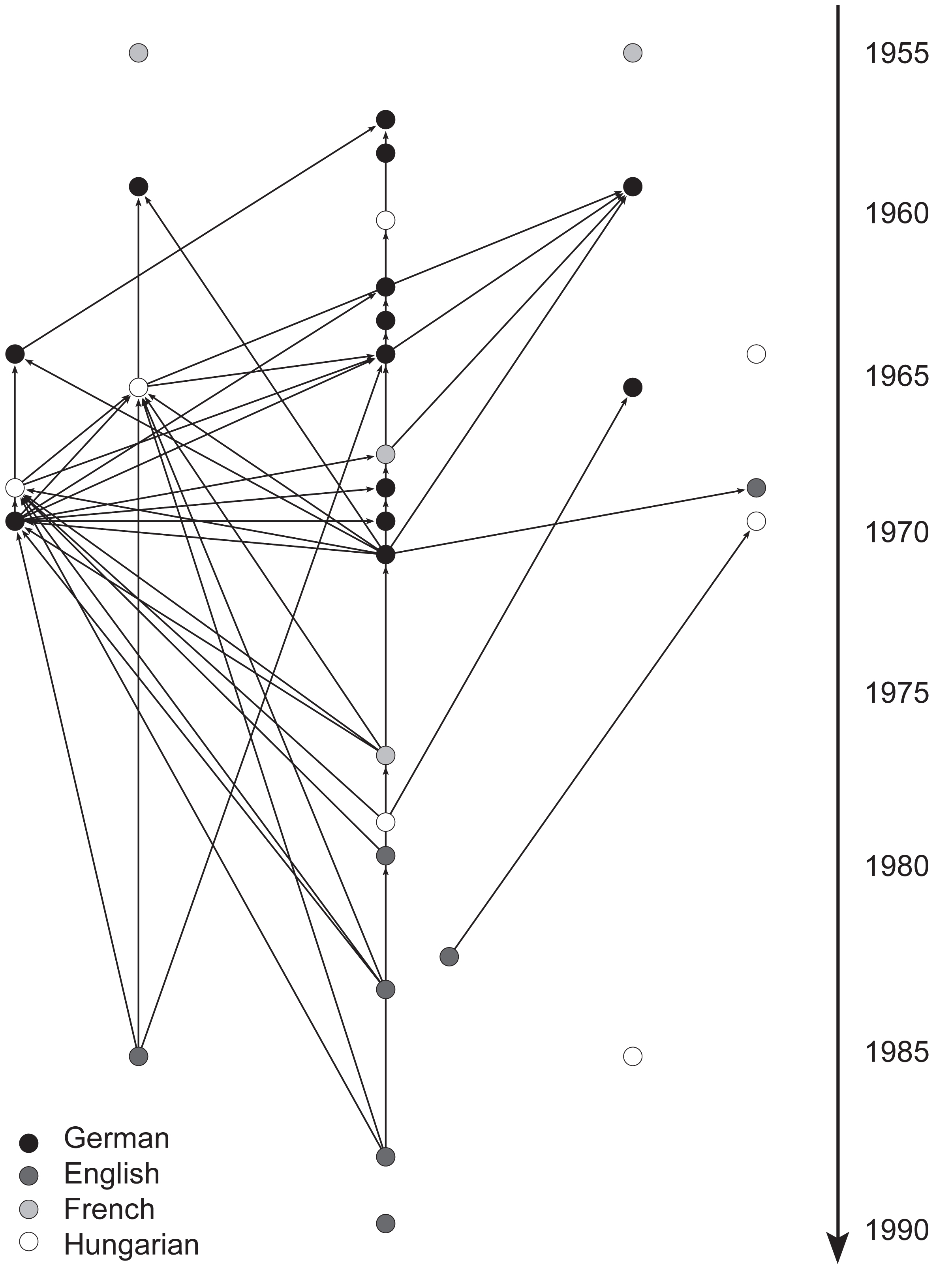 Chronological plot of citation network of Hungarian Palaeolithic researchers. Nodes are publications and directed lines are citations. Colours reflect publication language.