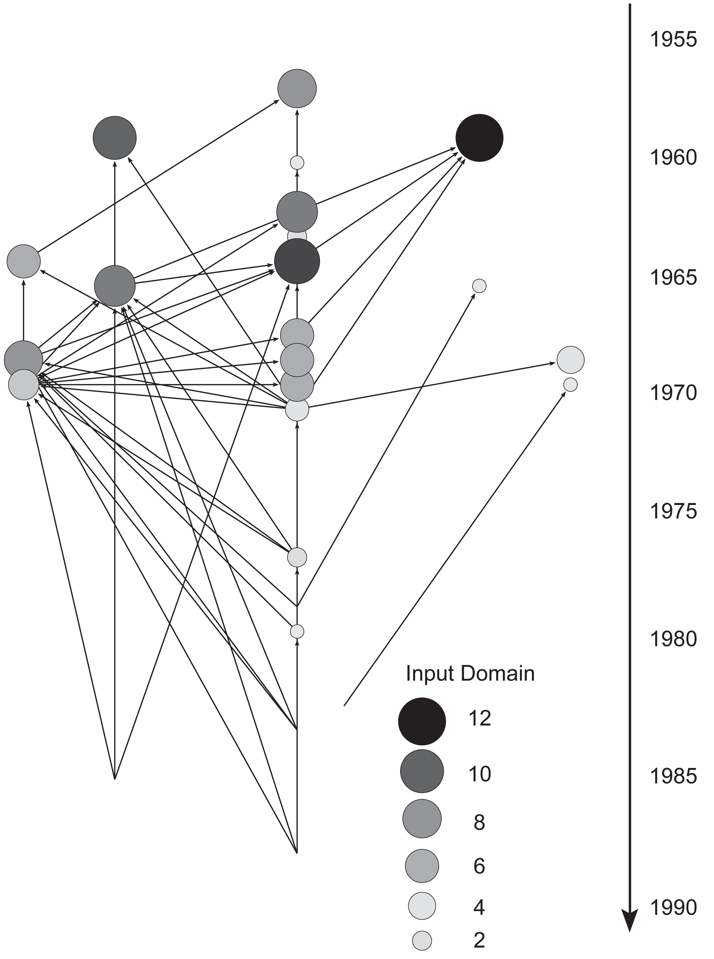 One would expect the older publications to be the most prominent since these had the time to accumulate the largest number of citations, and the results do show this process to some extent. Using the input domain measure (de Nooy et al., 2005: p. 193) we found that a few publications from the 50’s and early 60’s can be connected to by a larger number of nodes than any of the publications from the late 60’s and later, which indicates that these few publications influenced (directly or indirectly) the largest number of other publications. All of these publications with a high input domain were in fact written by a single author László Vértes who, although being very often cited by his colleagues, is guilty of quite a bit of self-citation as well. Although self-citation is common in academia and completely understandable (one always builds on one’s previous research), we needed to evaluate to what extent this affects the analytical techniques used. In this case the input domain seems to reflect largely the citation behaviour of one scholar who was extremely active throughout several decades.