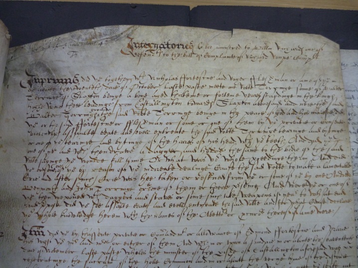 Libel – the creation and spreading of a message in order to defame somebody – was an offence on the rise throughout England at the end of the sixteenth and beginning of the seventeenth centuries. The increase in the number of libel offences at this period is said to be due to a series of high profile cases which set a precedent and a change in the definition of libel in the late sixteenth century from a moral offence tried in the church courts to a criminal one tried in the national court of Star Chamber (W. S. Holdsworth, A History of English Law, 7 Vols., Vol. V, (London: Methuen & Co. Ltd., 1903-24, 1924). Once tried in Star Chamber, libellers were punished for the ability of their libels to cause breaches of the common peace. Commonly, provincial libels of the early modern period contained a public confrontation or humiliation carried out in a communal space within the town or village followed by some attempt to disseminate abroad, either by written text or symbolic object, or by singing or reading aloud, the contents of a libel. Examples of libel content from Devon include verses, letters, playing cards with writing on them, cuckold’s horns with various embellishments and mock-royal proclamations. Our knowledge of these communal events comes from the court records of their subsequent trials in the Star Chamber. These records normally include a bill of complaint, submitted to the court by the victim, outlining what was done by whom. They also include lists of interrogation questions to be ministered to witnesses and defendants (see figure 1) and accounts of the examinations that followed.