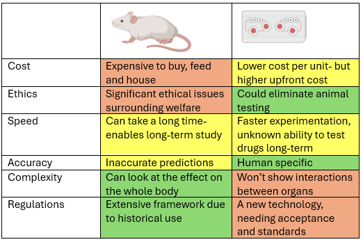 OoC’s could Refine testing by Reducing and Replacing the use of animal models. These 3R’s are part of the European Union’s guidelines on ethical animal testing. If regulatory authorities allow the use of OoC’s It would reduce public objections to testing drugs and cosmetics on animals. However, a major drawback of organ-on-a-chip technology is that it only mimics single organs. This means it can’t show how drugs are processed in interacting organs, like the stomach, before reaching their target, which could lead to inaccurate results.