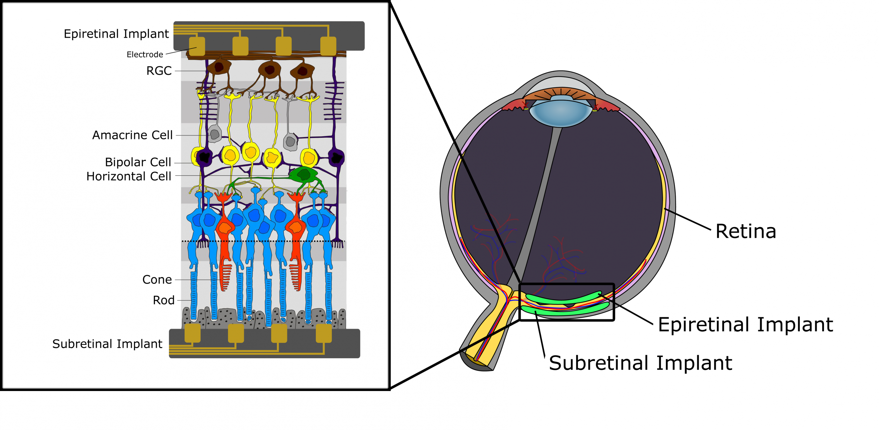 Retinal implants are prosthetic devices that aim to restore some vision to those with vision loss by replacing the role of photoreceptors. They can be epiretinal (on the inner surface of the retina), subretinal (behind the retina) or suprachoroidal (between the choroid and the sclera) and they work by using direct electrical stimulation or by using photodiodes [10].
