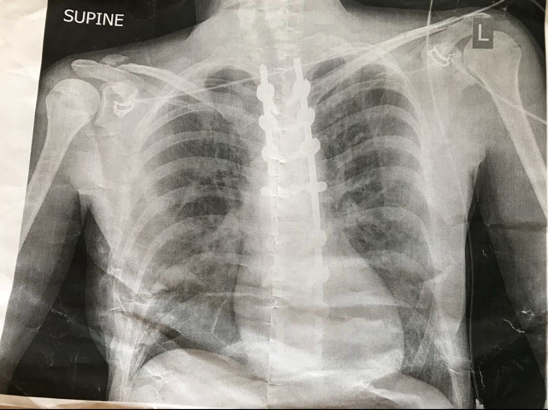 Spinal implants following an SCI promote host tissue regeneration and nerve plasticity and reconnection. These can help to recover some muscle function. Following her accident, my mum had surgically implanted titanium rods to stabilise her vertebrae, allowing the facet joints to heal. Her X-Ray is shown below.