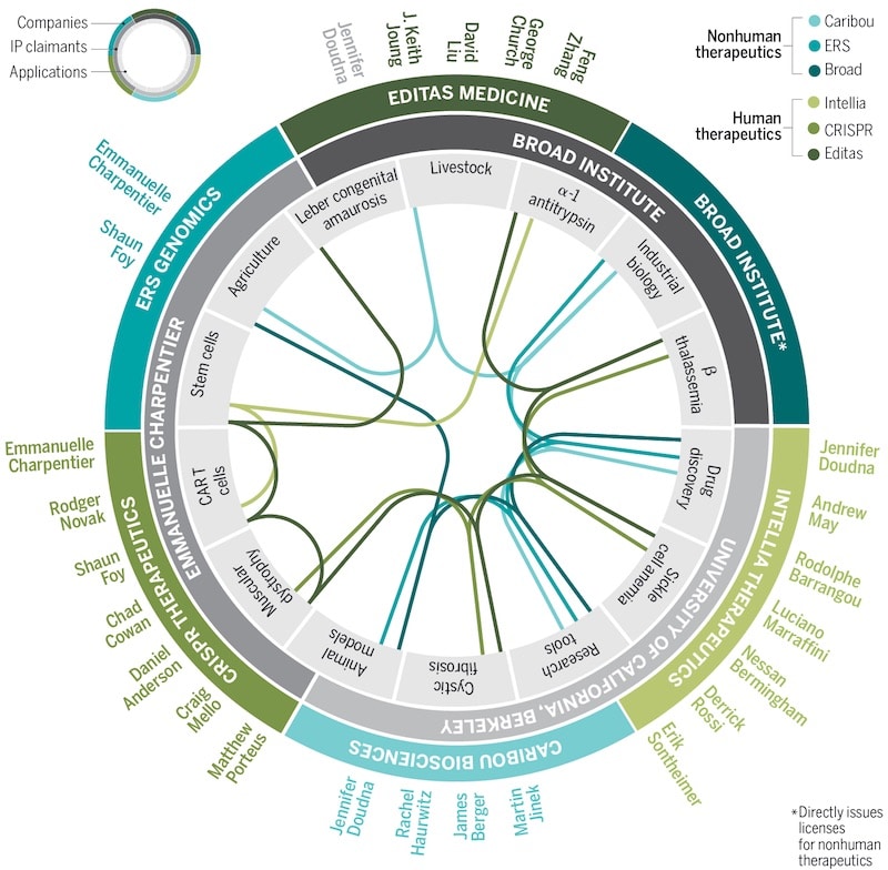Figure 3. Shows the complex network of CRISPR-Cas9 intellectual property ownership, applications and licensing (Rodríguez Fernández, 2018).